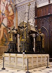 Columbus' remains were first interred at Valladolid, then at the monastery of La Cartuja in Seville (southern Spain) by the will of his son Diego, who had been governor of Hispaniola. In 1542 the remains were transferred to Santo Domingo, in eastern Hispaniola. In 1795 the French took over Hispaniola, and the remains were moved to Havana, Cuba. After Cuba became independent following the Spanish-American War in 1898, the remains were moved back to Spain, to the Cathedral of Seville, where they were placed on an elaborate catafalque.
